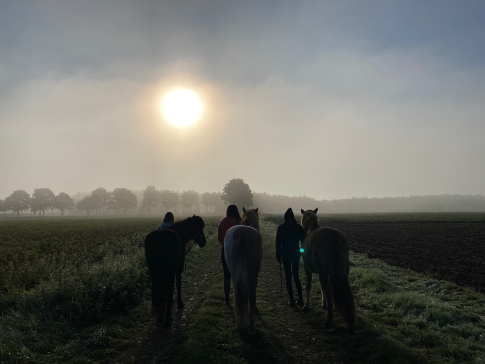 Zu unseren Aufgaben gehörten unter anderem die tägliche Versorgung der Pferde, diverse Aufgaben auf dem Hof und im Haus. Selbst vor dem Roden der Brennnesselwälder sind wir nicht zurückgeschreckt. Besonders gut hat uns die Arbeit mit den Ponys gefallen und natürlich auch die ein oder andere Reitstunde hat viel Spaß gemacht. Dank unseren täglichen Aufgaben waren wir jeden Tag viel draußen in der schönen Heide und im angrenzenden Waldgebiet unterwegs, wobei auch dieses wunderschöne Foto im morgendlichen Nebel entstanden ist. Insgesamt hatten wir eine tolle Zeit hier auf dem Hof, konnten viele neue Dinge ausprobieren und einiges Spannendes lernen.