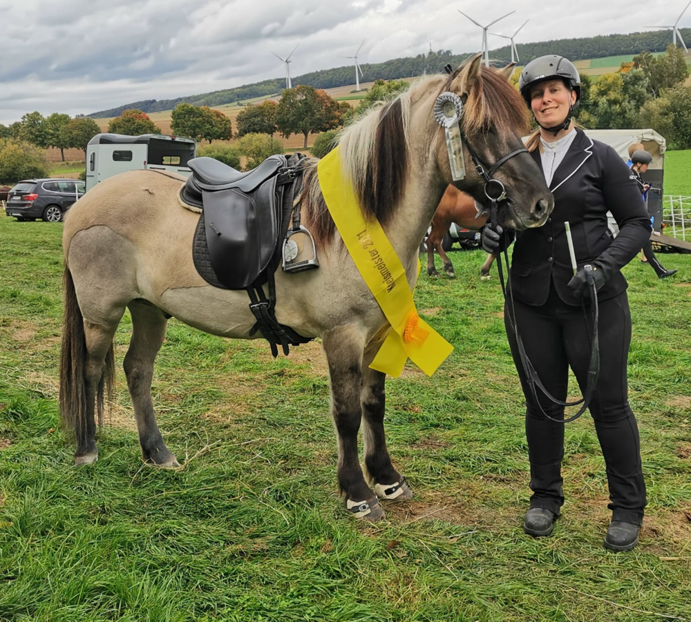 Nach kurzer Verschnaufpause ging es dann am Nachmittag mit der Finalprüfung im Tölt weiter, wo sich die beiden bis auf Rang zwei hochreiten konnten und somit überglücklich die Schärpe für